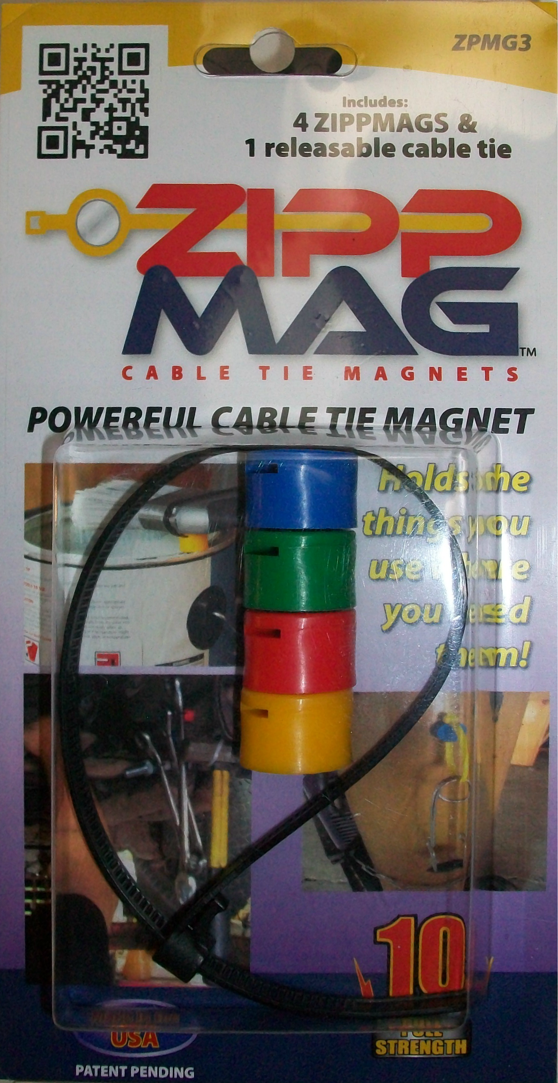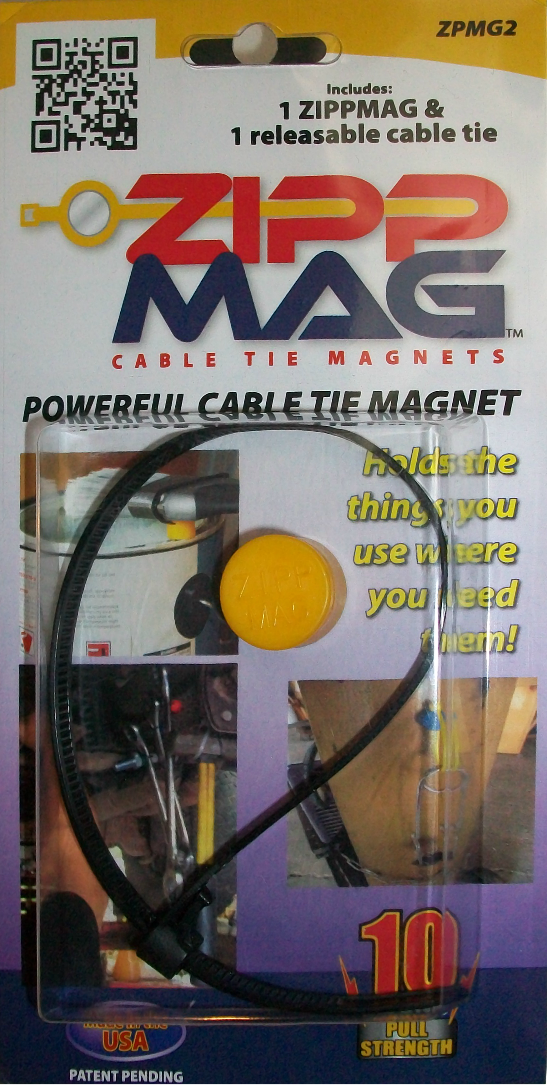 ZIPPMAGs are unique cable tie magnets that can be applied to virtually any object. From wrenches, hammers, air tools and screwdrivers, to flashlights, fishing rods and fly swatters, their uses are limited only by your imagination. Use them in the garage, the shop and in the kitchen. Use them at school or in the office to hang poster boards or banners. If you have a magnetic surface and need to hang an object, you can do so with ZIPPMAGs. These revolutionary “Super Magnets” create 10+ lbs. of pull, each!